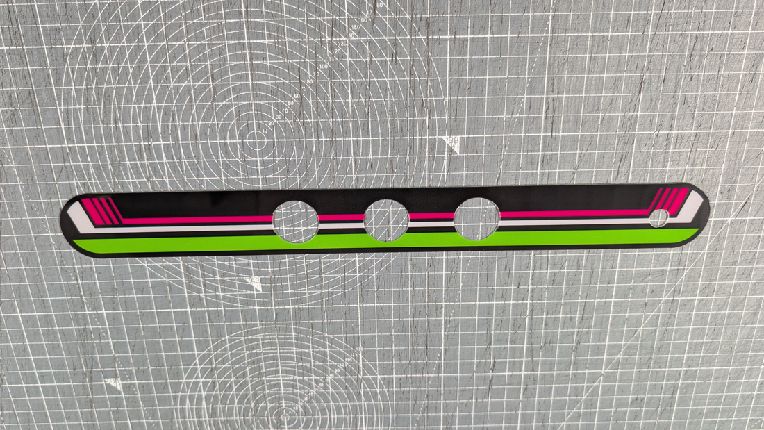 Reverse printed UV ink on 0.375mm polycarbonate with a 3m adhesive backing, fully CNC cut to shape.
