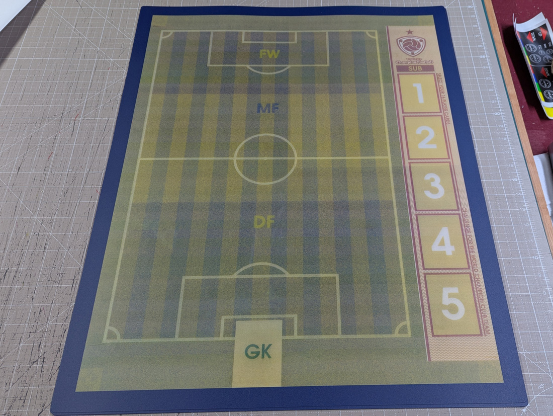 Reverse printed to 0.375mm textured matte polycarbonate and cut to original shape.